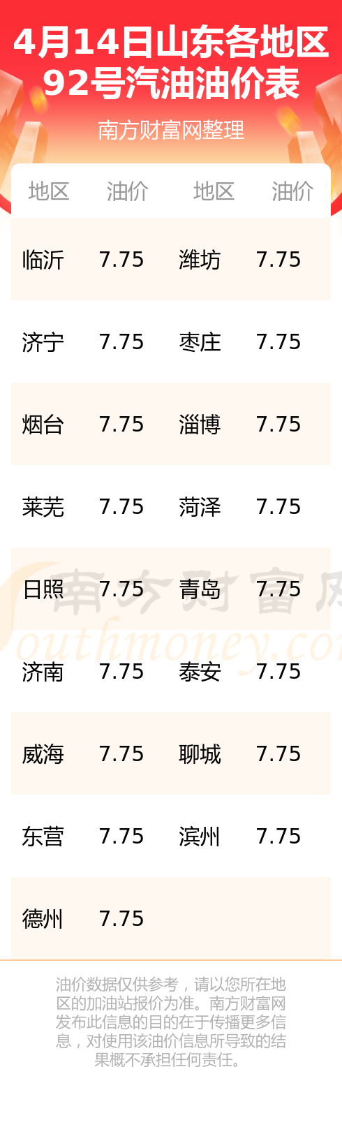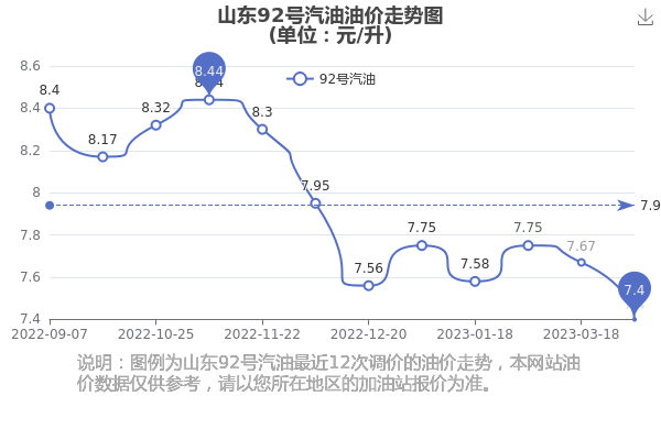4月14日,山东92号汽油的最新价格为7.4元/升,本轮油价调整时间是4月1日,对比上次调整共降了0.27元,降3.52%。