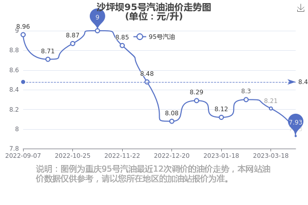 4月16日沙坪坝95号汽油的价格为7.93元/升,为4月1日油价调整后的价格,相对上次调整下降了0.28元,下降3.41%。