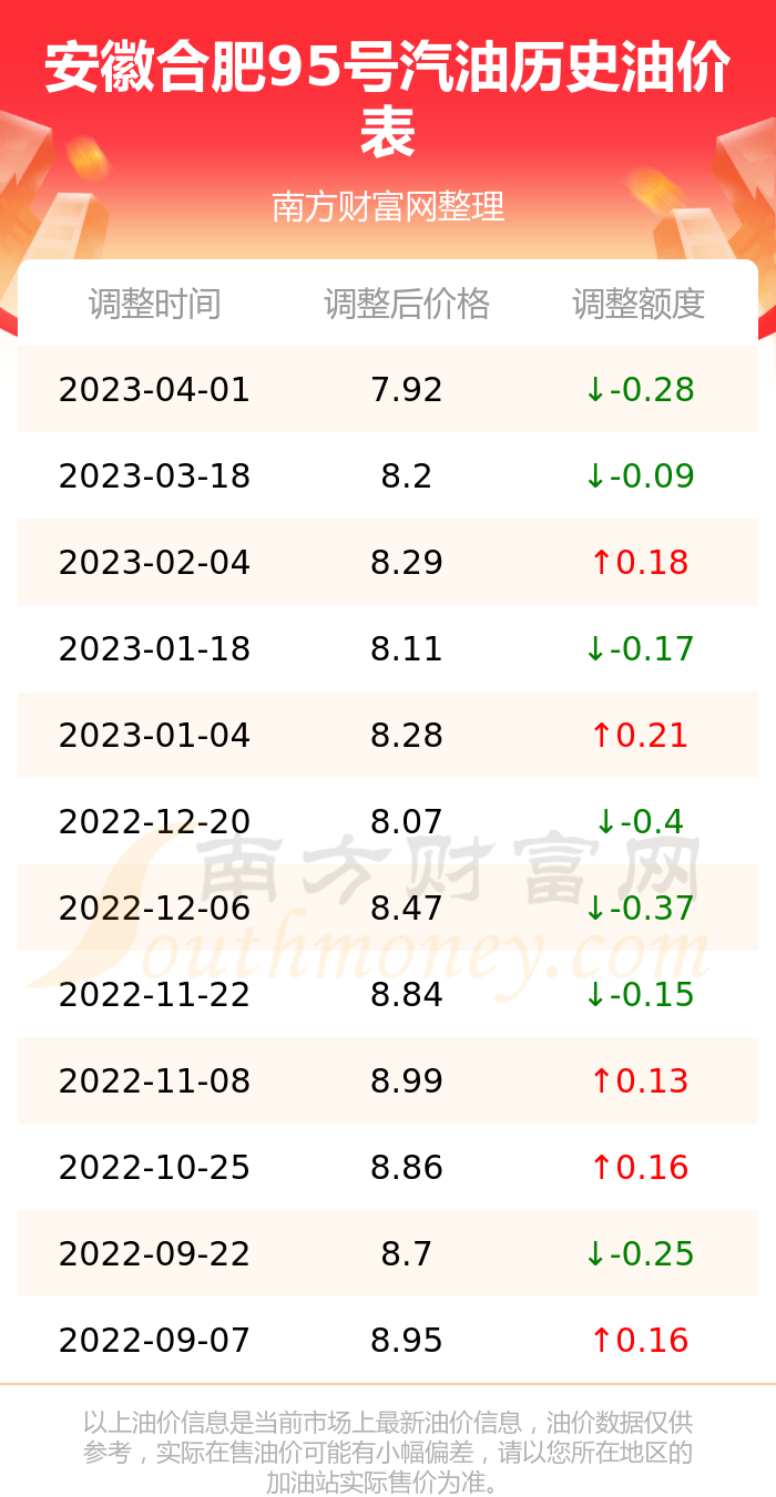 安徽合肥95号汽油历史油价表