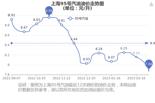 4月18日上海95号汽油价格是7.88元每升,这是4月1日调整后的价格,相对上一轮调整时间3月18日的油价8.16元/升,下调了0.28元。