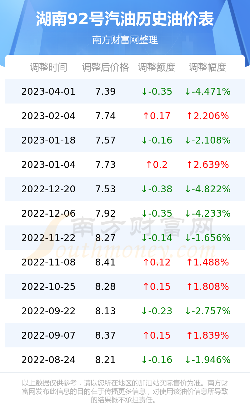 4月18日湖南92号汽油的价格为7.39元/升,本轮调整时间是4月1日,相对比上一轮调整跌了0.35元,跌4.471%。