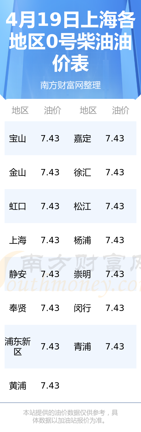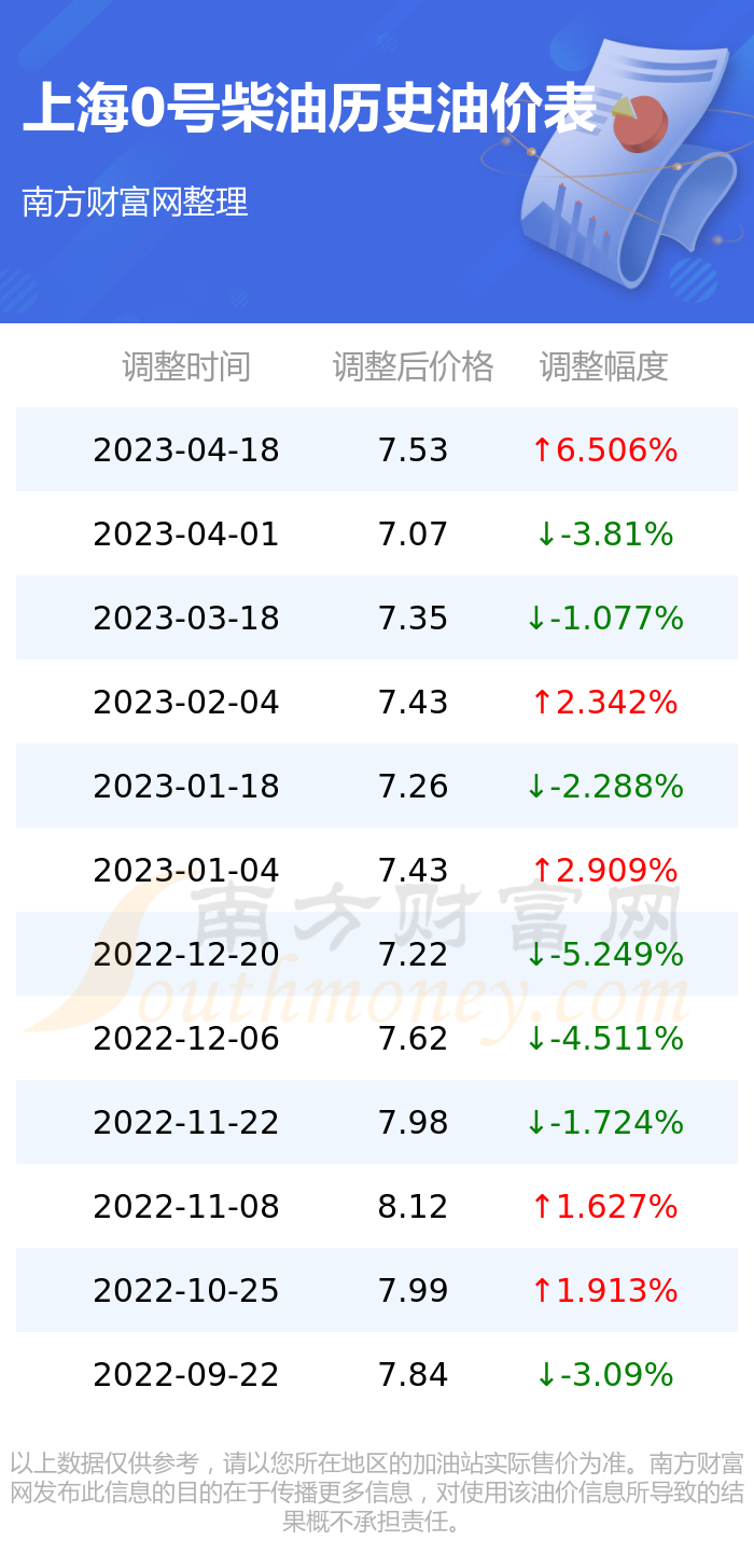 4月19日,上海0号柴油的最新价格为7.53元/升,是4月18日调整后的价格,对比上次油价调整上涨了0.46元,上涨6.506%。