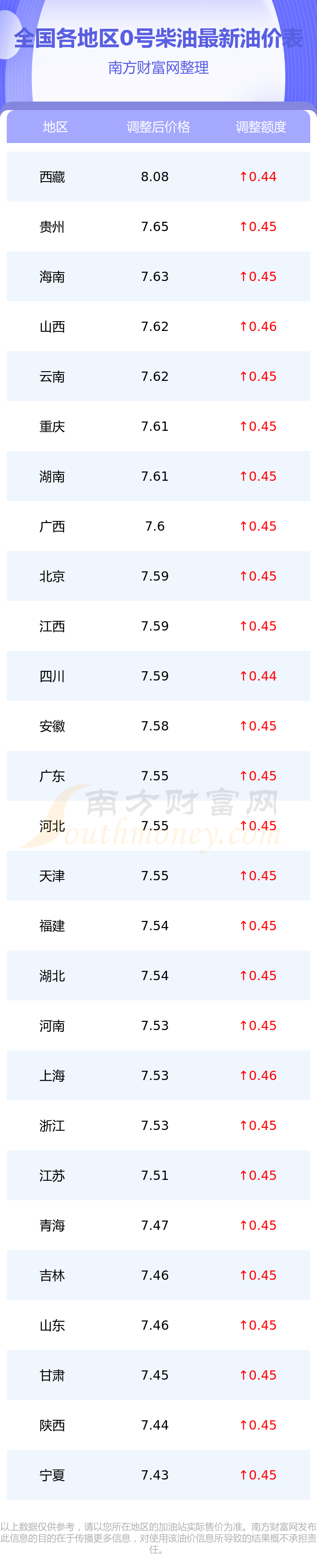 全国0号柴油4月19日的价格多少钱一升?4月18日油价调整后,详情如下:平均价格为8元/升,最低的是宁夏,价格7.43元/升,最高的是西藏,价格8.08元/升。