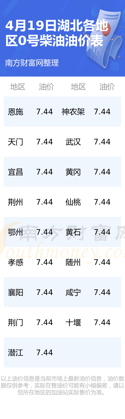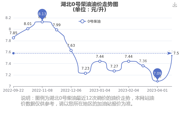 4月19日,湖北0号柴油价格为7.54元每升,调整时间为4月18日,相对上次调整时间4月1日的油价7.09元/升,涨了0.45元。