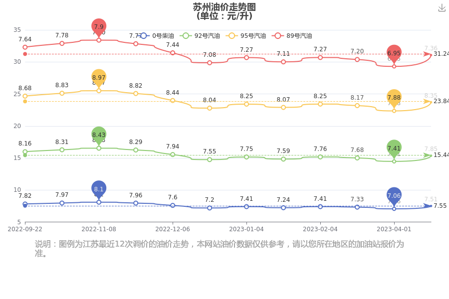 4月21日,苏州汽油、柴油每升的价格是多少?4月18日油价调整后,92号汽油为7.85元,升了0.44元,升幅达5.94%;95号汽油为8.35元,升了0.47元,升幅达5.96%;89号汽油为7.36元,升了0.41元,升幅达5.9%;0号柴油为7.51元,升了0.45元,升幅达6.37%。