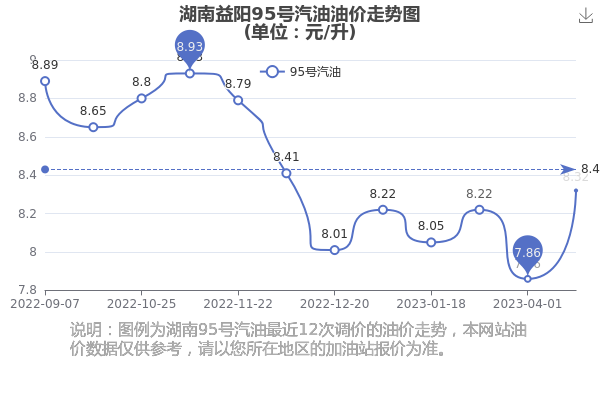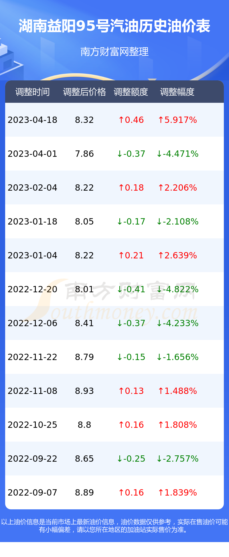 湖南益阳95号汽油4月21日的价格为8.32元/升,本次油价的调整时间为4月18日,对比上次油价调整时间4月1日的价格7.86元/升,共上升了0.46元,上升幅达5.917%。