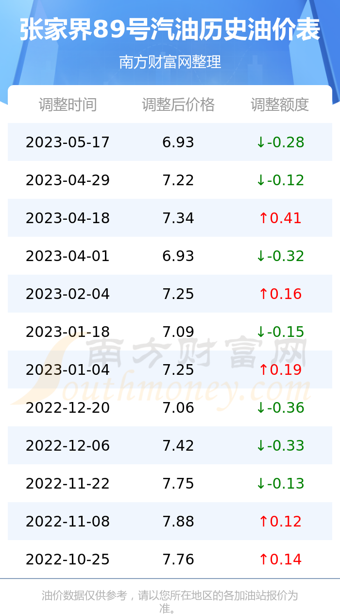 张家界89号汽油历史油价表