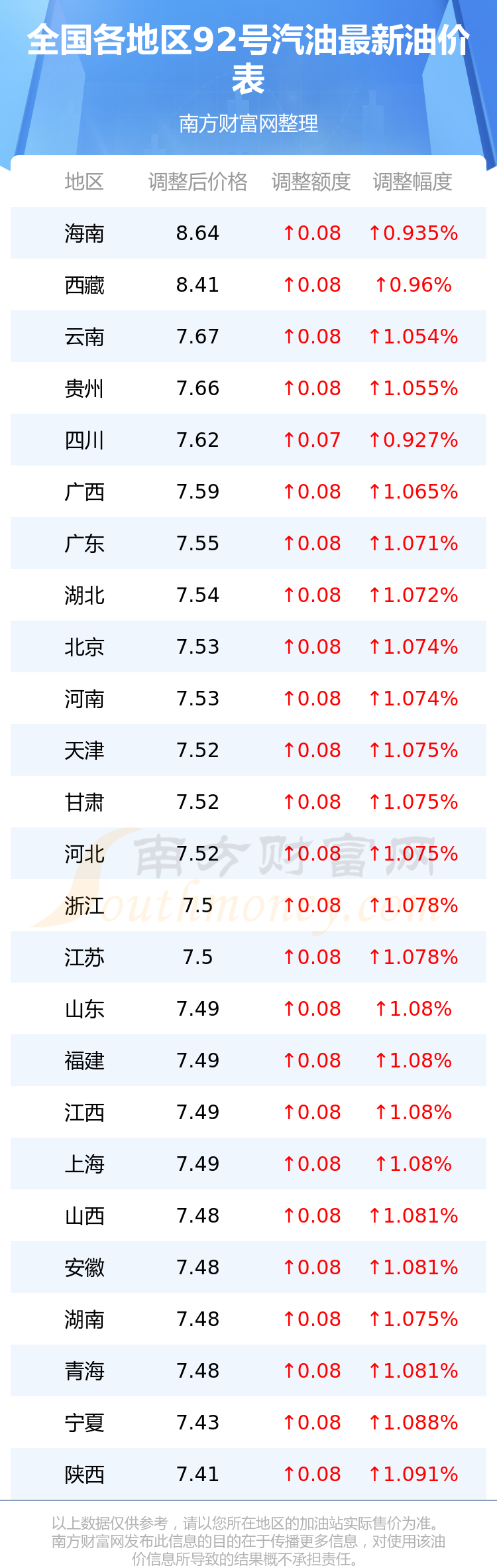 全国各地区最新92号汽油油价表