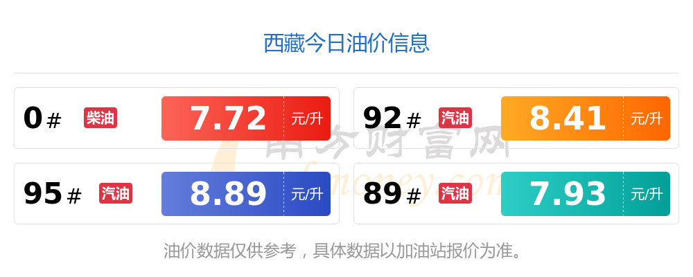 西藏汽油、柴油6月5日每升最新价格多少钱一升?本次油价调整时间为5月31日,92号汽油为8.41元,上调了0.08元;95号汽油为8.89元,上调了0.08元;89号汽油为7.93元,上调了0.07;0号柴油为7.72元,上调了0.08元。