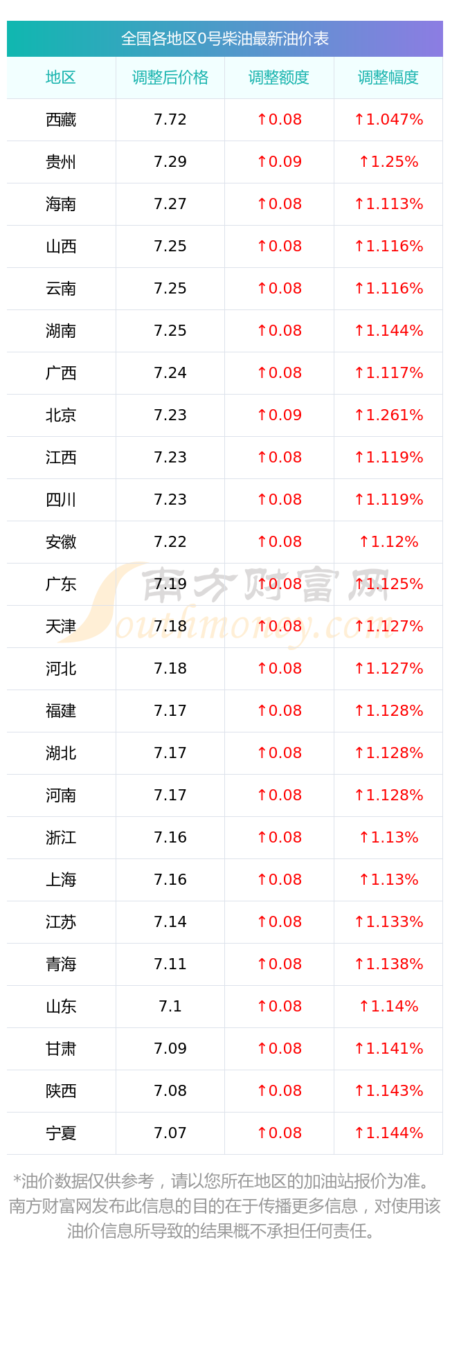 全国各地区最新0号柴油油价表