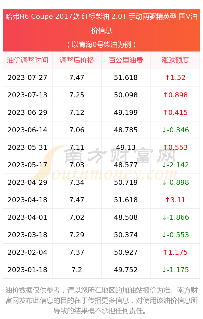 根据7月27日0号柴油最新调整价格7.47元/升来计算(以青海为例),该车型每百公里的平均油费是51.618元,上一轮7月13日调整价格7.25元每升来计算,每百公里的平均油费是50.098元,对比上一轮多花1.52元,下一轮的油价调整时间是8月8日24时。