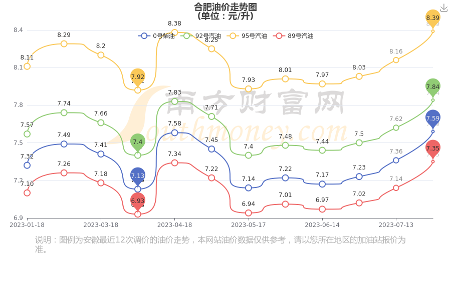 8月2日,合肥汽油、柴油每升最新价格为:92号汽油为7.84元,上升了0.22元;95号汽油为8.39元,上升了0.23元;89号汽油为7.35元,上升了0.21元;0号柴油为7.59元,上升了0.23元,调整时间为7月27日。