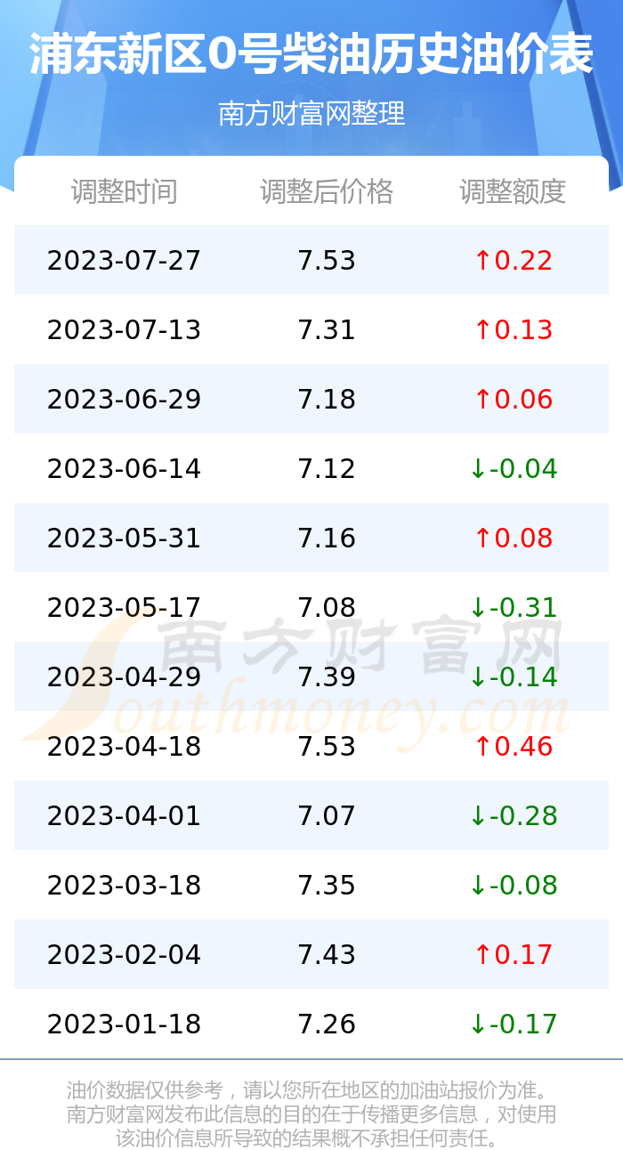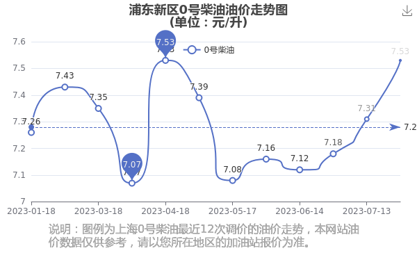 浦东新区0号柴油8月2日最新价格为7月27日油价调整后的价格,具体为7.53元/升,相对上次调整时间7月13日的油价7.31元每升,共涨了0.22元,涨3.01%。
