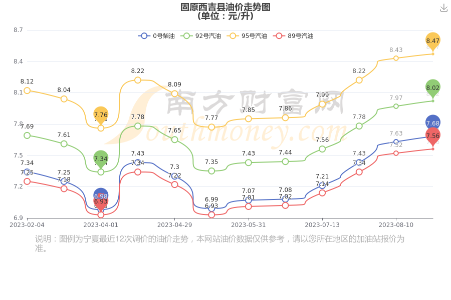 9月18日固原西吉县汽油、柴油价格是8月24日调整后的价格,每升价格具体为:92号汽油为8.02元,上升了0.05元,上升幅达0.63%;95号汽油为8.47元,上升了0.04元,上升幅达0.47%;89号汽油为7.56元,上升了0.04元,上升幅达0.53%;0号柴油为7.68元,上升了0.05元,上升幅达0.66%。