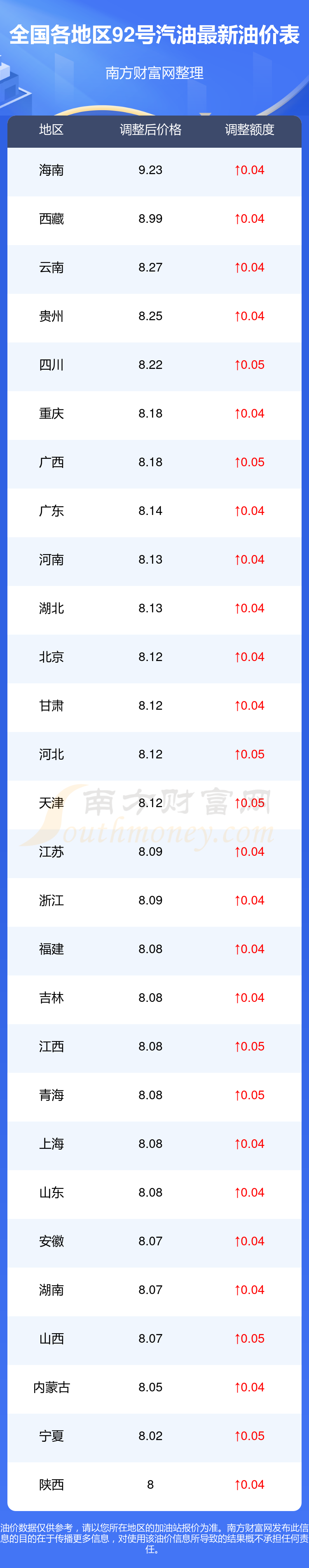 根据8月24日油价调整后的价格,全国92号汽油9月18日最新平均价格为每升8元,其中全国92号汽油最低为陕西,价格为8.00元/升,92号汽油最高为海南,价格为9.23元/升。
