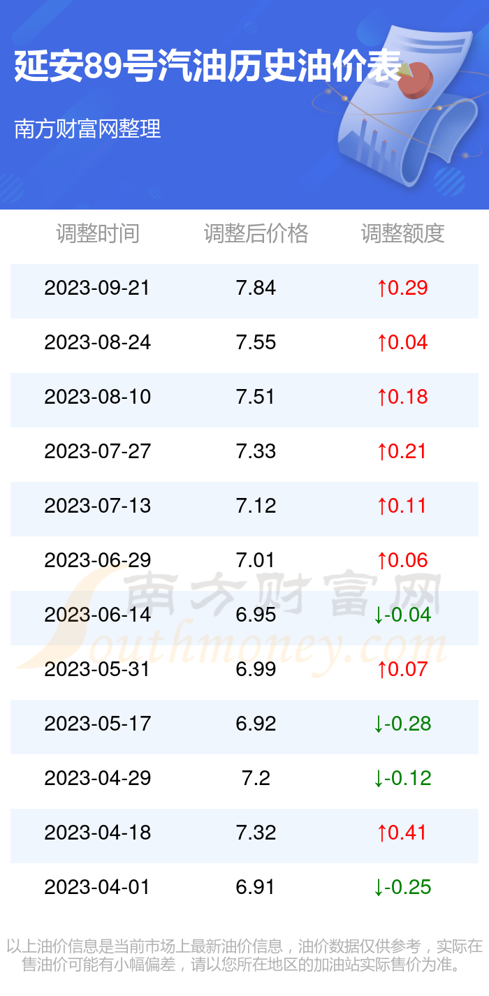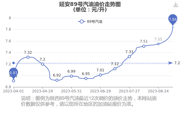 9月23日,延安89号汽油最新价格为:7.84元每升,调整时间为9月21日,相对上次调整时间8月24日的油价7.55元每升,增了0.29元,增幅达3.841%。