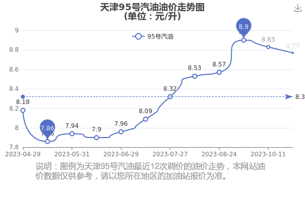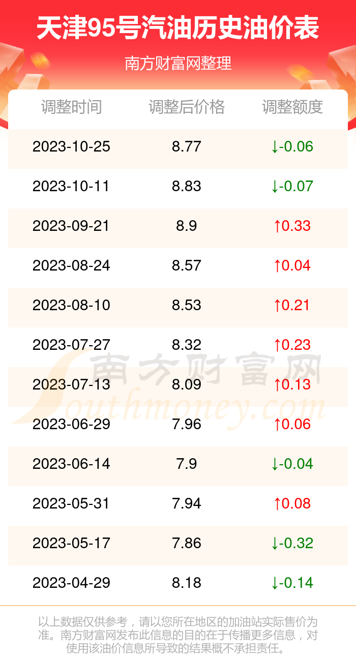 11月1日天津95号汽油的价格为8.77元每升,本次调整时间为10月25日,相对上次调整时间10月11日的油价8.83元每升,下降了0.06元,下降幅达0.68%。