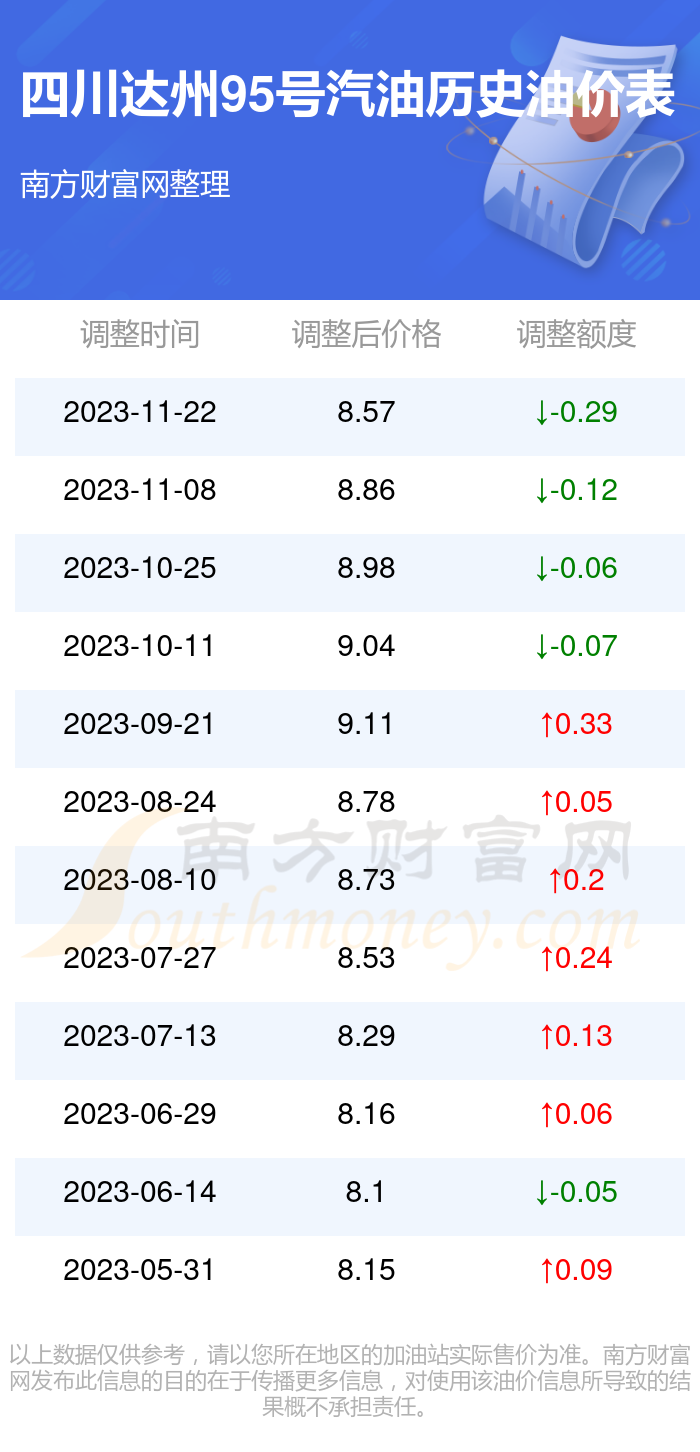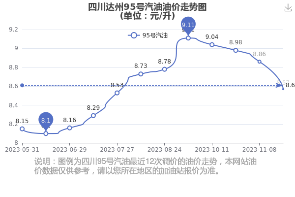 11月30日四川达州95号汽油的价格为11月22日油价调整后的价格,具体是每升8.57元,相对上次调整时间11月8日的油价8.86元每升,共跌了0.29元,跌3.273%。