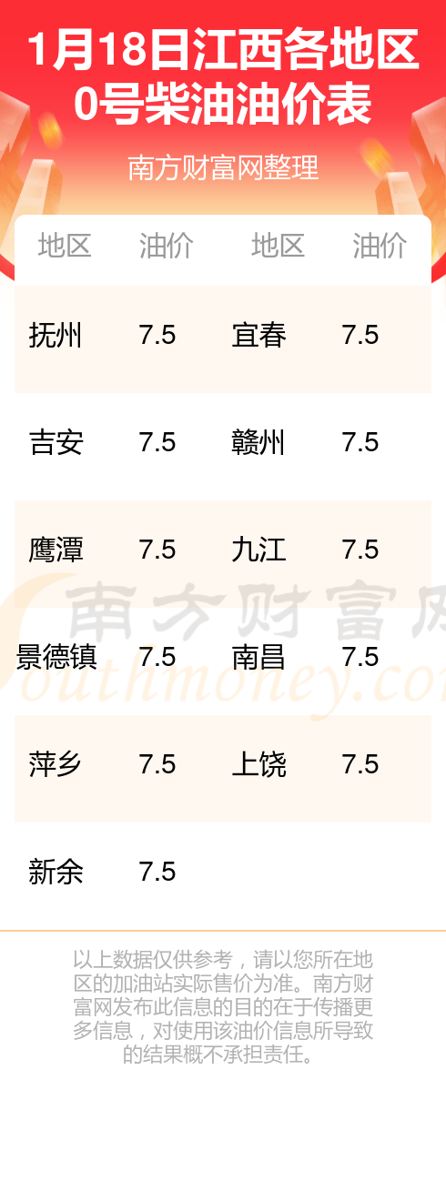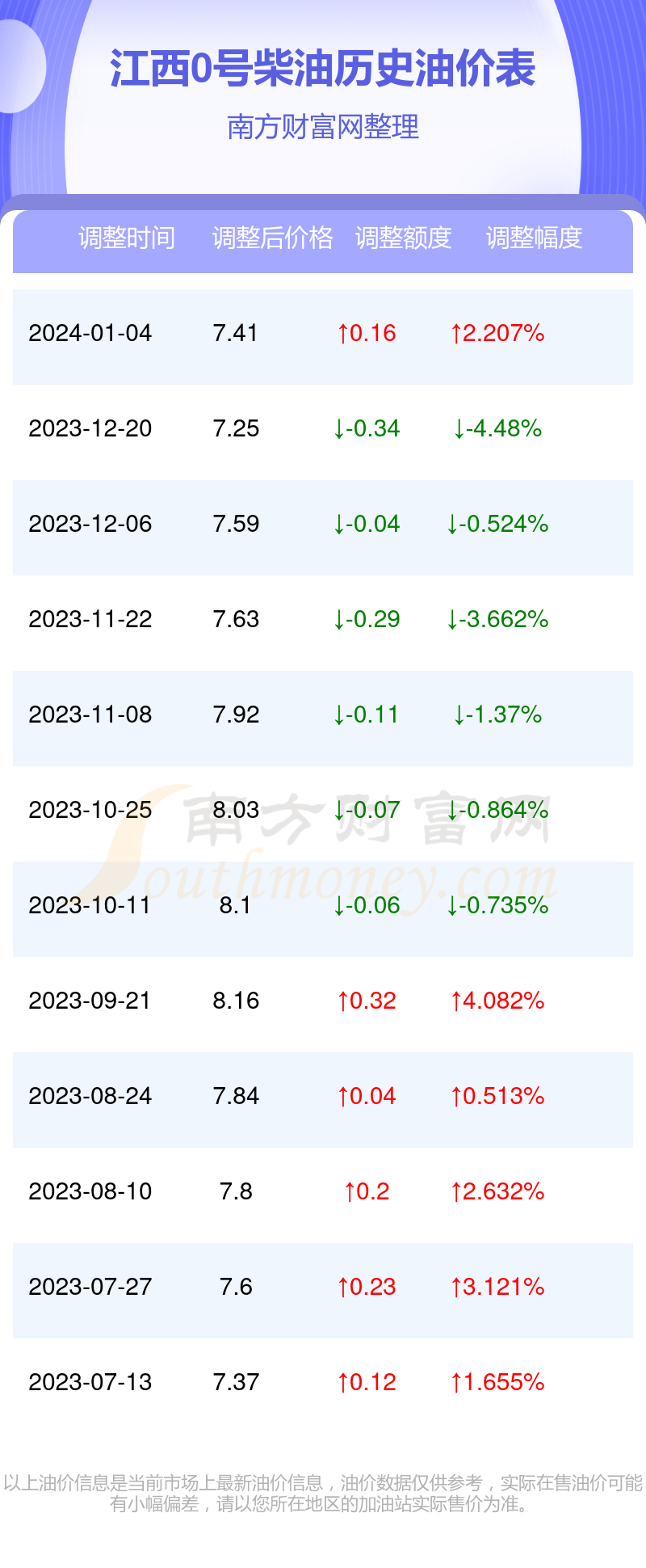 1月18日,江西0号柴油价格为7.41元每升,调整时间为1月4日,相对上次调整时间12月20日的油价7.25元/升,上调了0.16元。