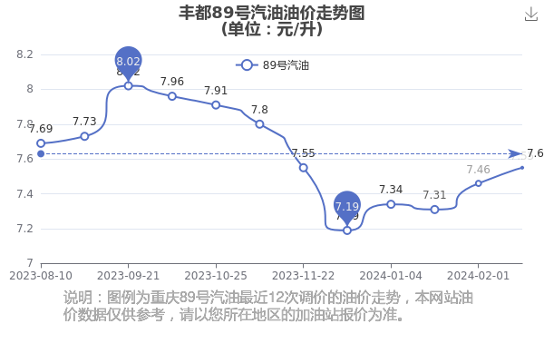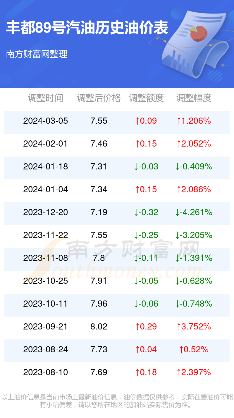 3月16日丰都89号汽油的价格为7.55元/升,本轮油价的调整时间为3月5日,相对上一轮油价调整时间2月1日的价格7.46元/升,上涨了0.09元,上涨幅达1.206%。