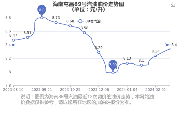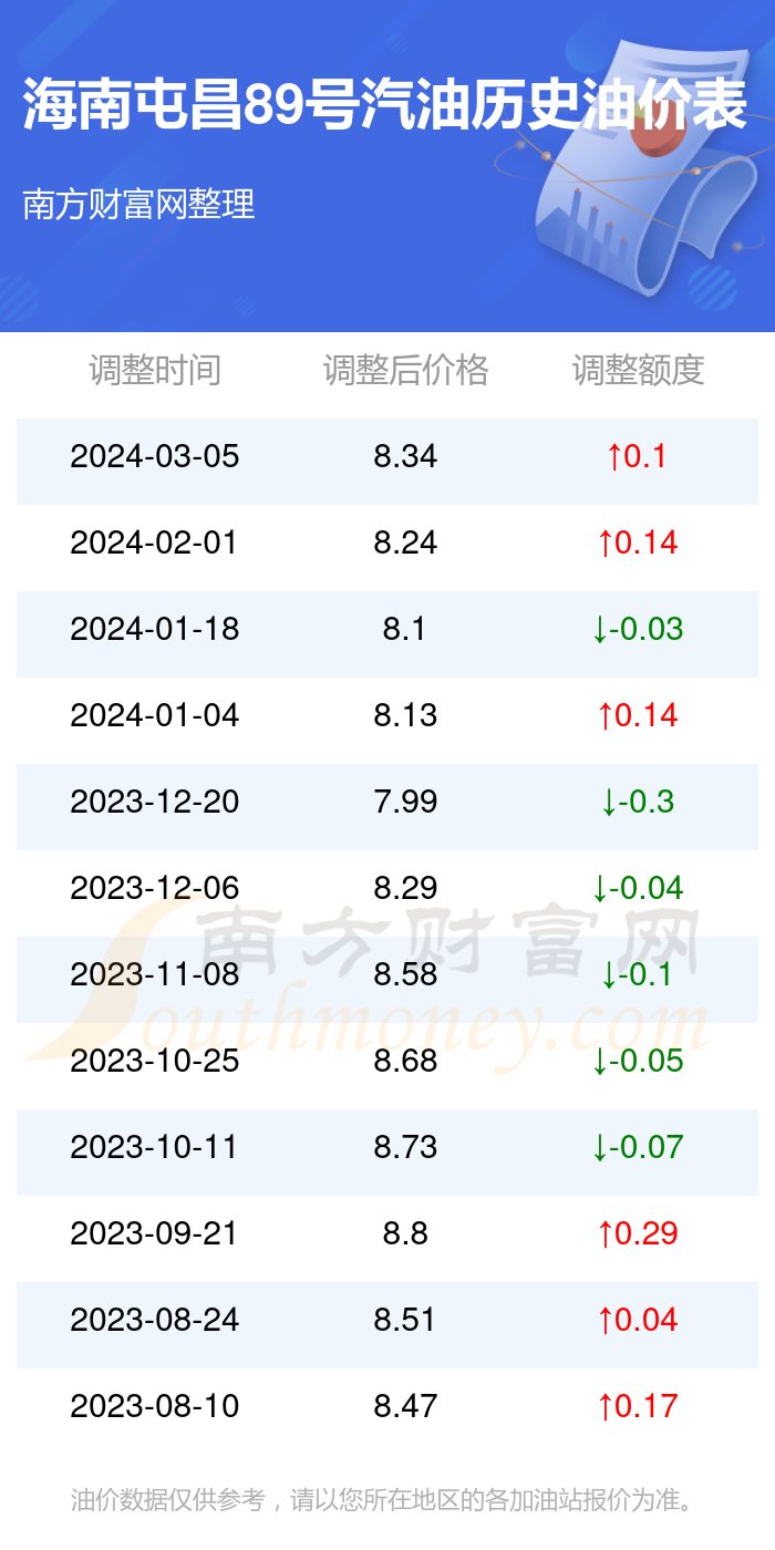 3月20日海南屯昌89号汽油的最新价格:海南屯昌89号汽油8.34元/升(根据3月5日调整后的价格),相对上次调整时间2月1日的油价8.24元每升,上升了0.1元,上升1.214%。