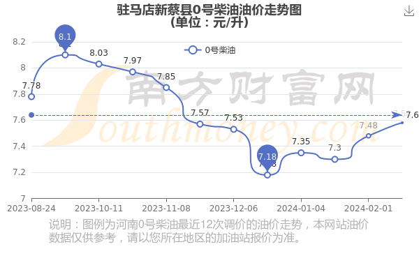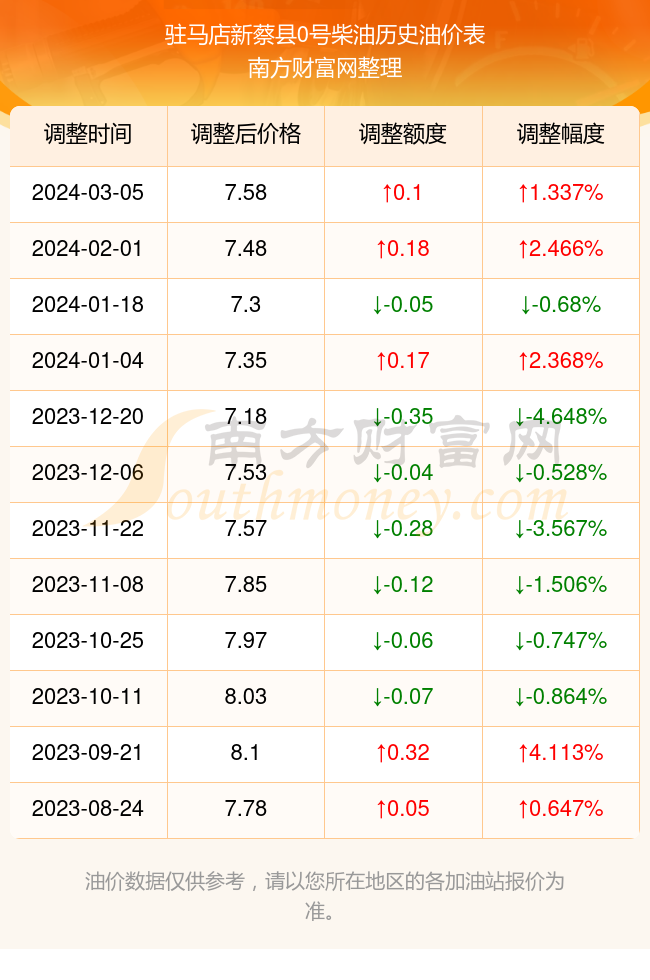 3月21日,驻马店新蔡县0号柴油价格为每升7.58元,这是3月5日油价调整后的价格,相对上次调整时间2月1日的油价7.48元每升,上调了0.1元,上调1.337%。