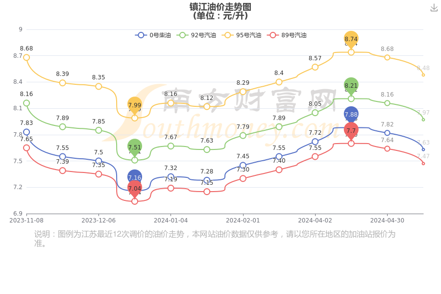 镇江汽油、柴油6月1日价格多少钱一升?具体为:0号柴油为7.63元,下降了0.19元;95号汽油为8.48元;92号汽油为7.97元;89号汽油为7.47元,调整时间为5月16日。