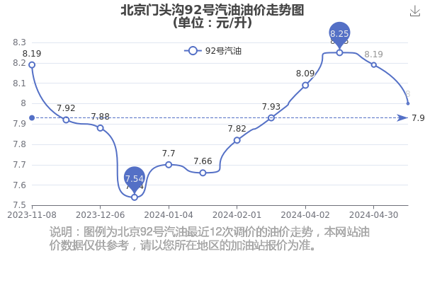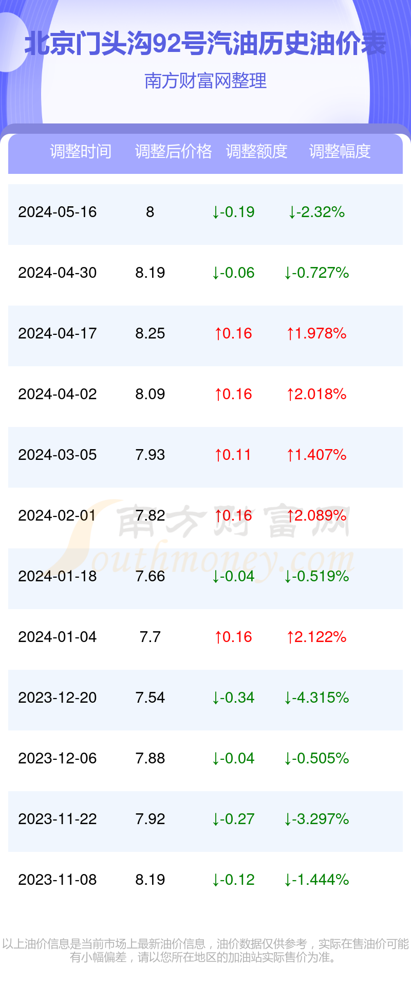 6月1日,北京门头沟92号汽油今日价格(调整时间为5月16日):8元每升,对比上次调整(4月30日)的油价8.19元每升,共降了0.19元,降幅达2.32%。