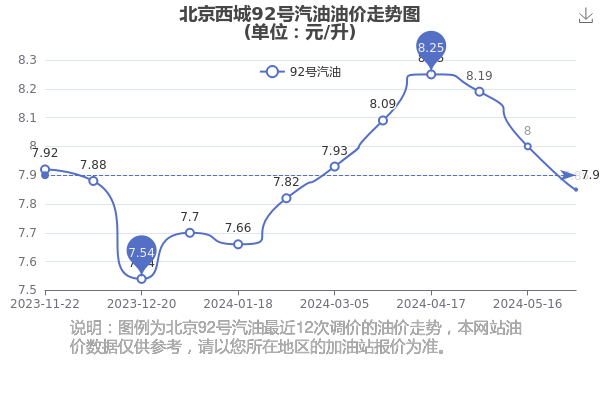 6月24日,北京西城92号汽油最新价格为:7.85元每升,调整时间为6月14日,相对上次调整时间5月16日的油价8元每升,下调了0.15元,下调幅达1.875%。