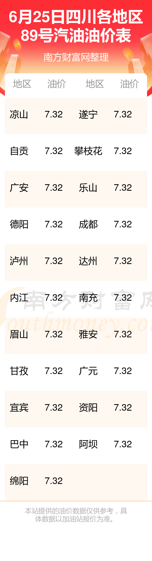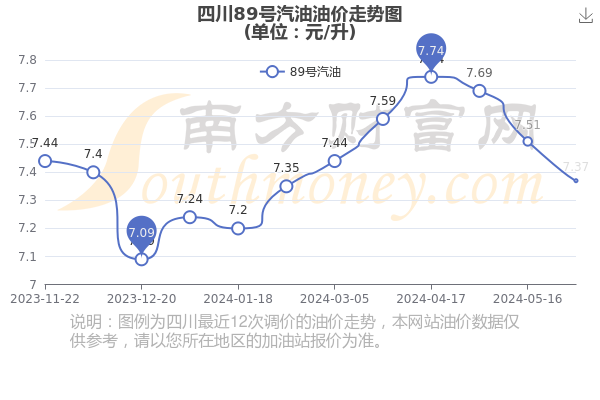 6月25日四川89号汽油价格为7.37元/升,调整时间为6月14日,相对上次调整时间5月16日的油价7.51元/升,下跌了0.14元。