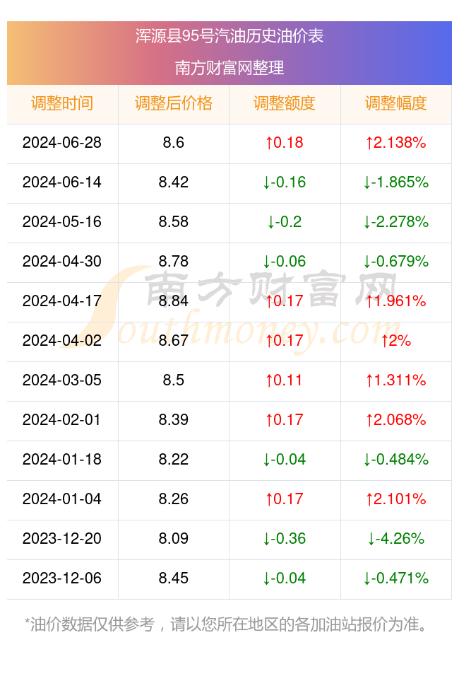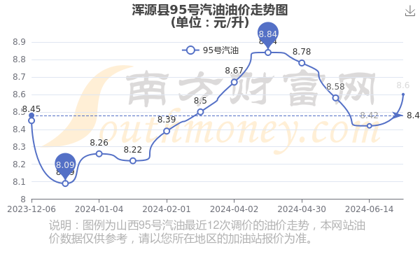 6月30日浑源县95号汽油的价格为8.6元/升,为6月28日油价调整后的价格,相对上次调整上升了0.18元,上升2.138%。