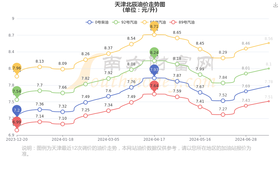7月21日天津北辰汽油、柴油的价格是7月12日调整后的价格,每升价格为:92号汽油为8.1元,上调了0.09元,上调幅达1.12%;95号汽油为8.56元,上调了0.1元,上调幅达1.18%;89号汽油为7.51元,上调了0.08元,上调幅达1.08%;0号柴油为7.78元,上调了0.09元,上调幅达1.17%。