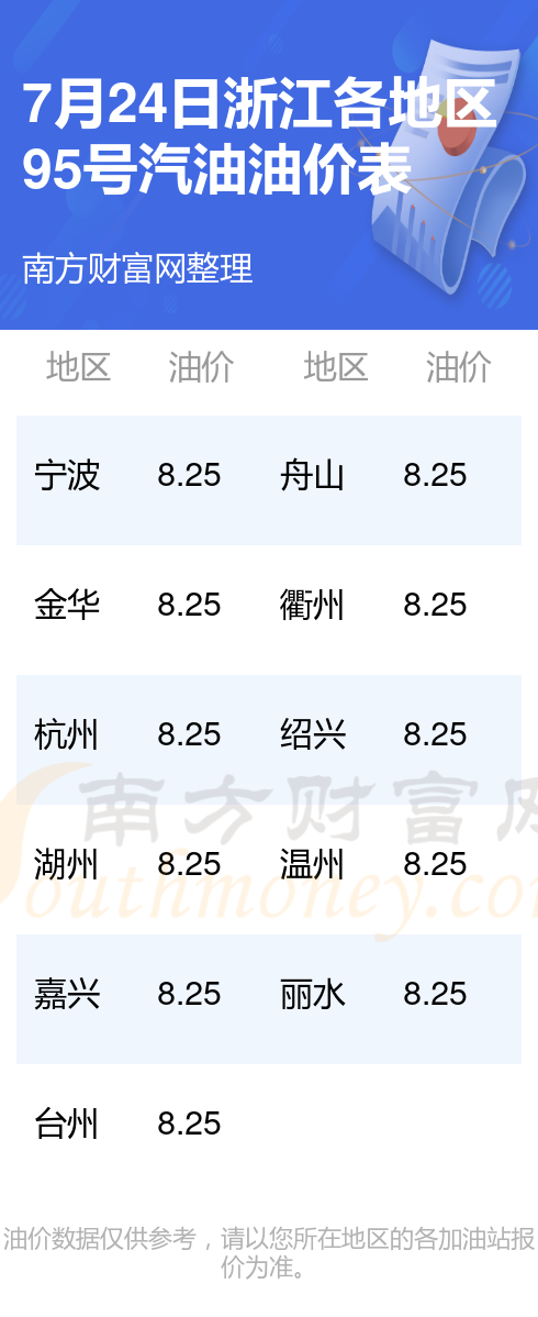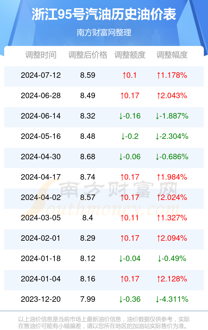 7月24日浙江95号汽油的价格为8.59元/升,本轮调整时间是7月12日,相对比上一轮调整上调了0.1元,上调1.178%。
