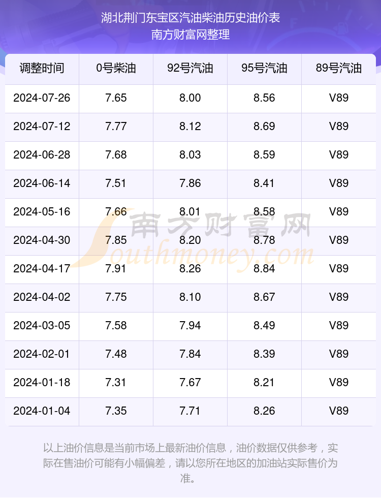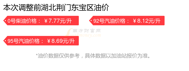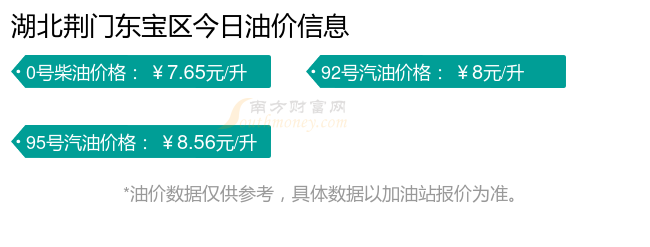湖北荆门东宝区汽油、柴油7月28日每升的价格具体是(7月26日调整后的价格):92号汽油8元;95号汽油8.56元;0号柴油7.65元。