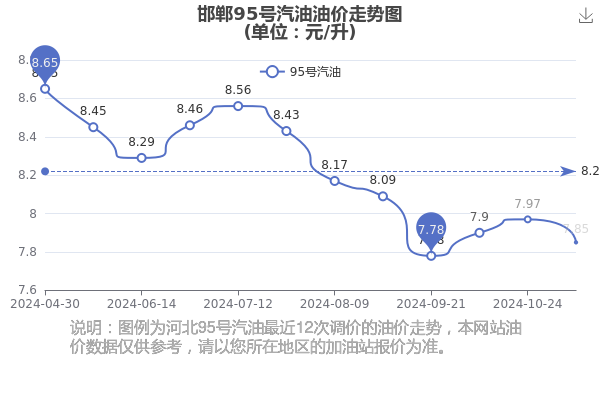 邯郸95号汽油11月17日的价格为每升7.85元,本次油价的调整时间11月7日,对比上次油价调整时间10月24日的价格7.97元/升,共下降了0.12元,下降幅达1.506%。