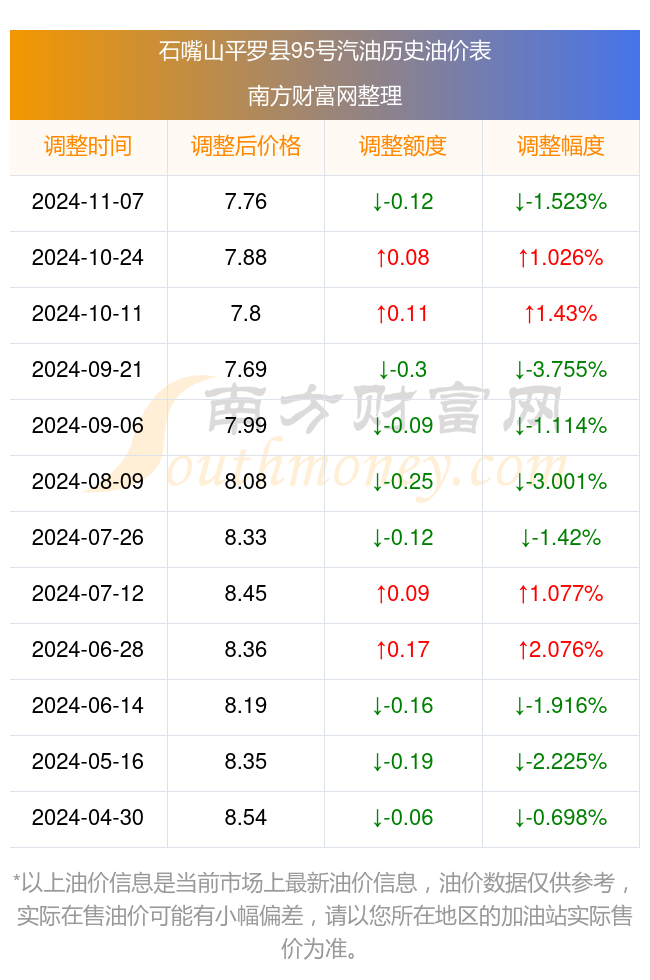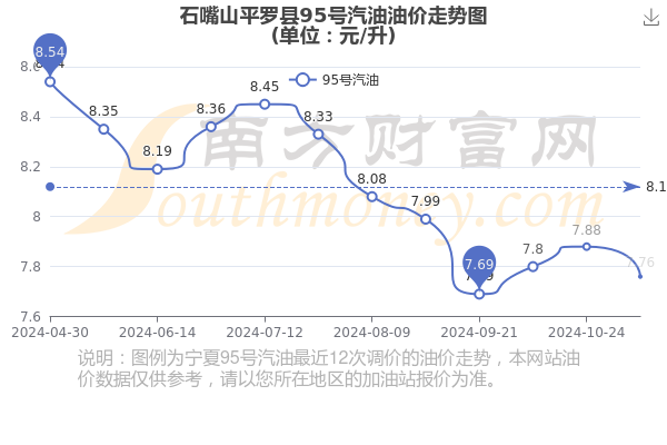 石嘴山平罗县95号汽油11月17日的价格为每升7.76元,本次油价的调整时间11月7日,对比上次油价调整时间10月24日的价格7.88元/升,共下降了0.12元,下降幅达1.523%。