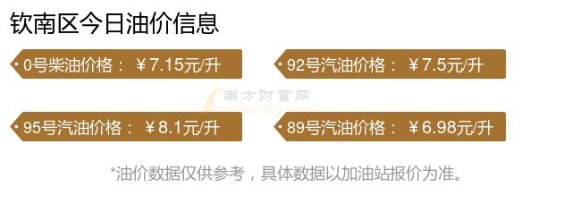 钦南区汽油、柴油11月17日每升的价格(油价调整时间11月7日):92号汽油7.5元;95号汽油8.1元;89号汽油6.98元;0号柴油7.15元。