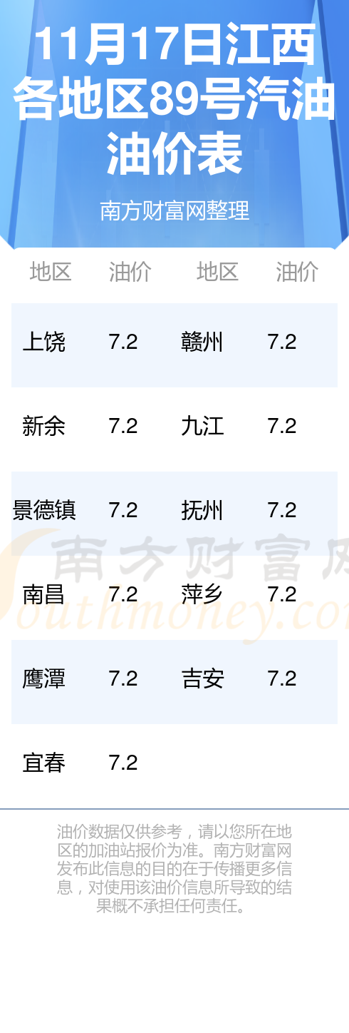 江西各地区最新89号汽油油价表