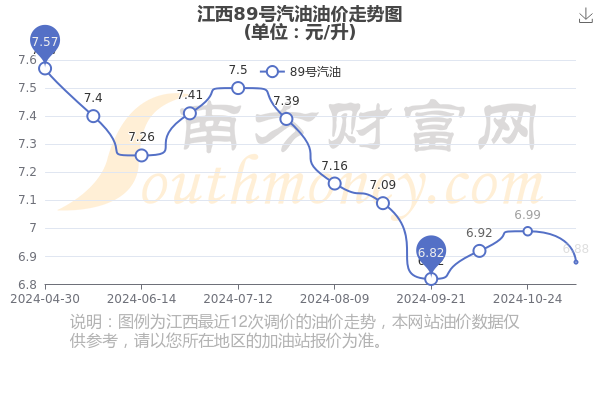 11月17日,江西89号汽油的价格是6.88元每升,本次的调整时间为11月7日,对比上次的调整下调了0.11元,下调1.574%,11月18日24时为下一轮油价调整时间,还有2天。