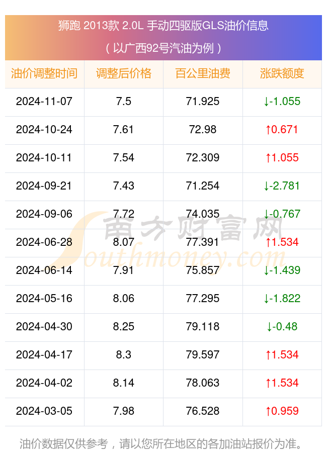 按11月7日92号汽油最新调整价格7.5元每升来计算(以广西为例),该车型百公里平均油费为71.925元,按上一轮10月24日调整价格7.61元每升来计算,百公里平均油费为72.98元,对比上一轮少花1.055元,下一轮油价调整时间为12月2日24时。
