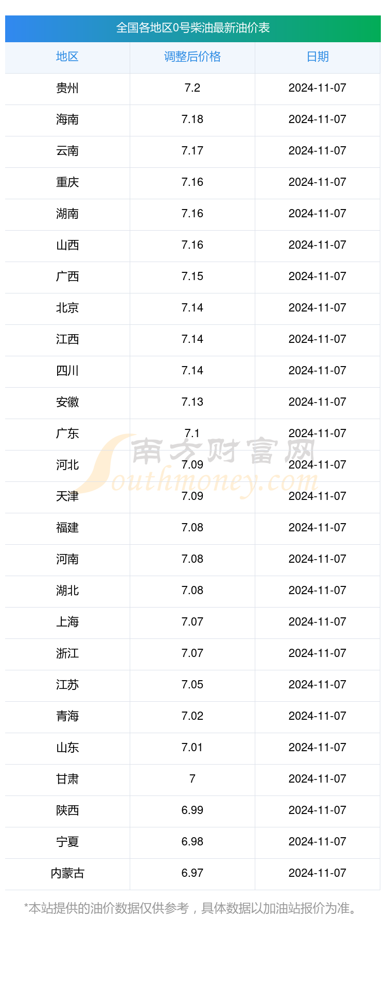 11月20日全国0号柴油最新平均价格为7元每升,本次油价格调整时间为11月7日,其中,全国0号柴油最低为内蒙古,价格6.97元/升,0号柴油最高为贵州,价格7.20元/升。