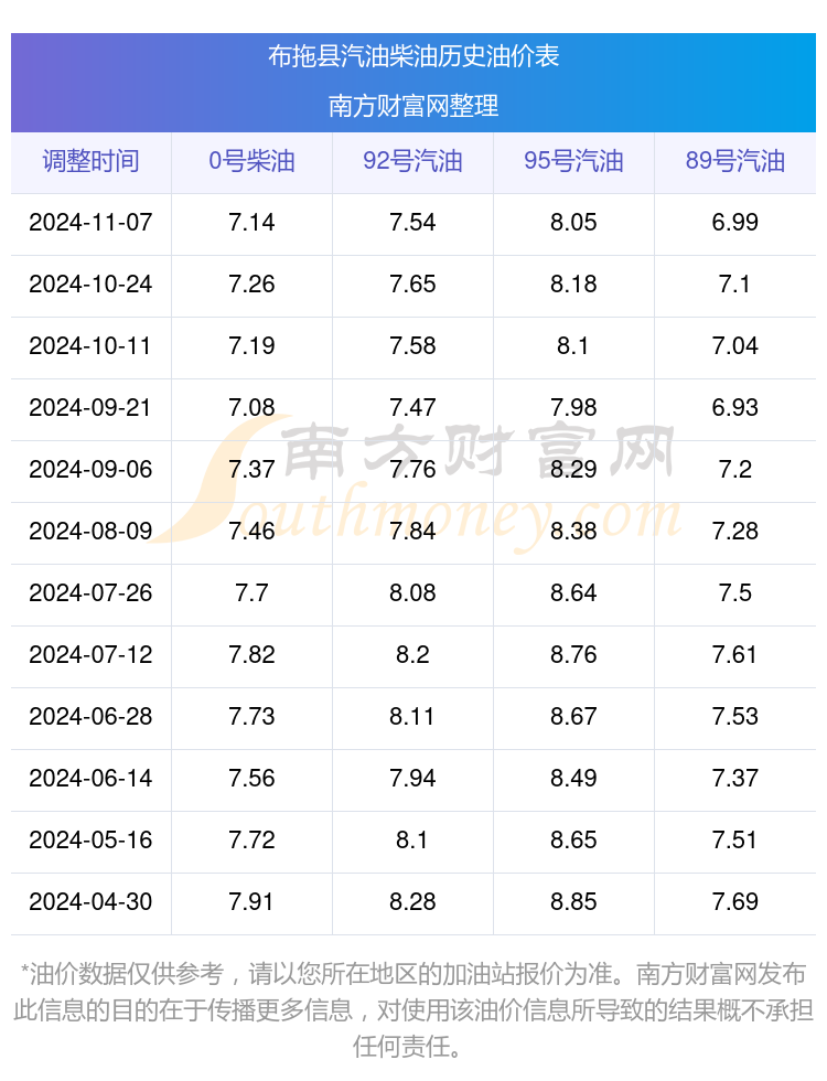 11月23日布拖县汽油、柴油的价格是11月7日调整后的价格,每升价格为:92号汽油为7.54元,下降了0.11元,下降幅达1.44%;95号汽油为8.05元,下降了0.13元,下降幅达1.59%;89号汽油为6.99元,下降了0.11元,下降幅达1.55%;0号柴油为7.14元,下降了0.12元,下降幅达1.65%。