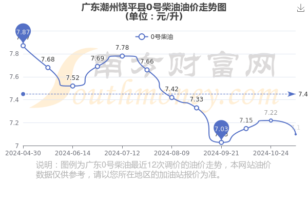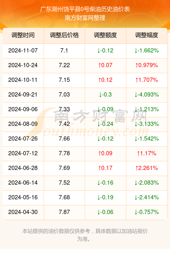 广东潮州饶平县0号柴油11月24日的价格为每升7.1元,本次油价的调整时间11月7日,对比上次油价调整时间10月24日的价格7.22元/升,共下跌了0.12元,下跌幅达1.662%。