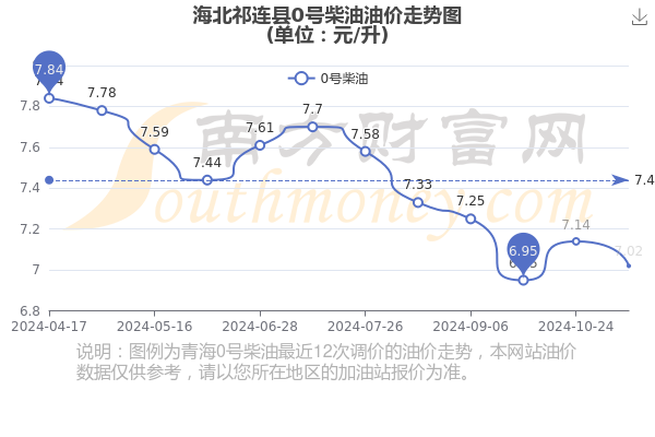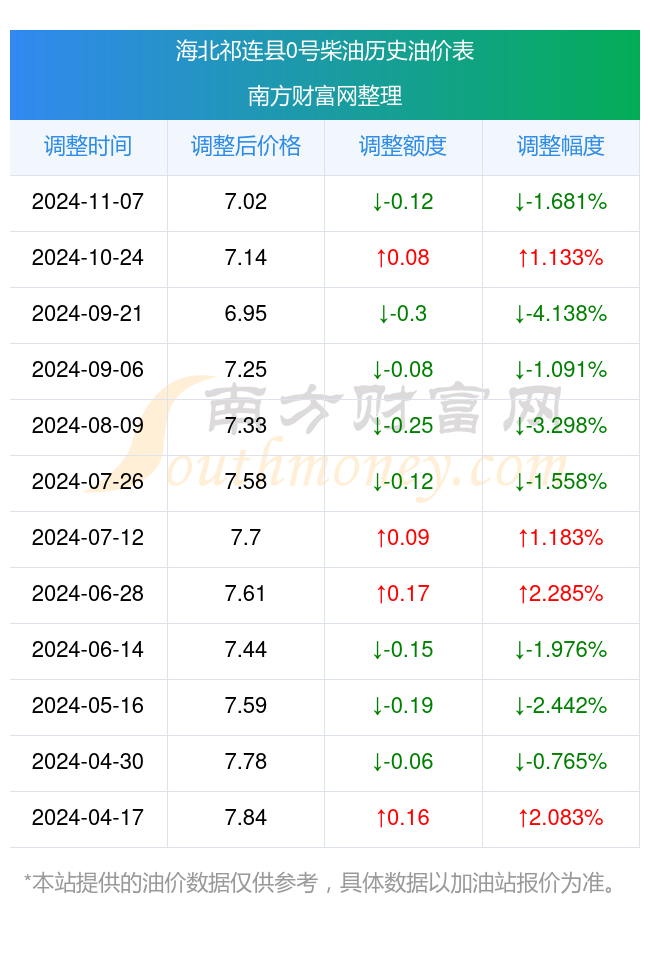 11月24日海北祁连县0号柴油价格查询:每升7.02元(11月7日油价调整后的价格),相对上次调整时间10月24日的油价7.14元每升,减了0.12元,减1.681%。