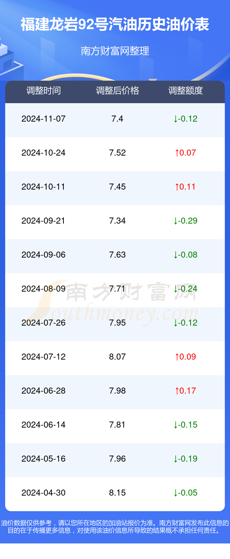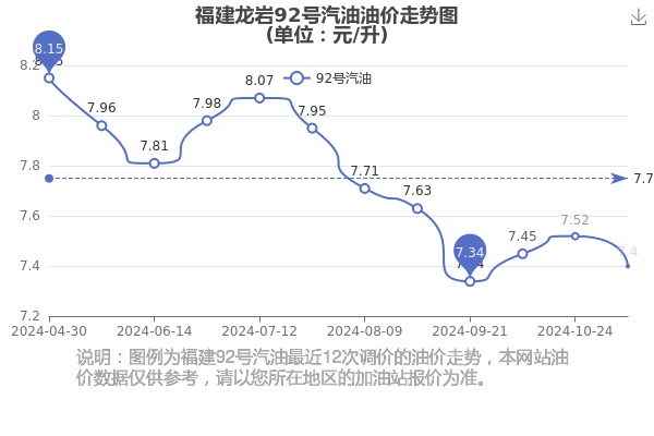 福建龙岩92号汽油11月24日的最新价格(11月7日油价调整后的价格):福建龙岩92号汽油7.4元/升,相对上次调整时间10月24日的油价7.52元每升,减了0.12元,减1.596%。