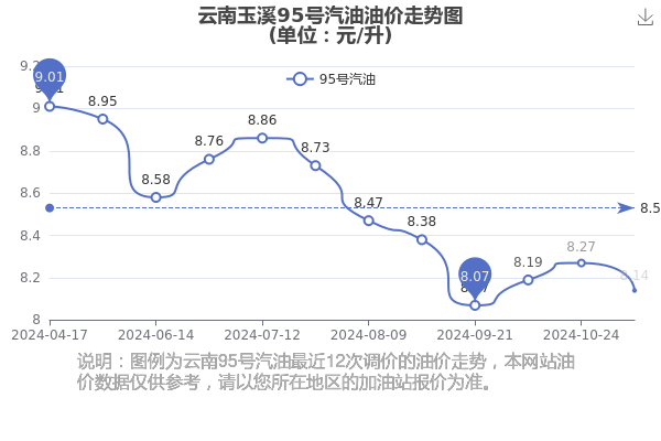 云南玉溪95号汽油11月24日最新价格为8.14元/升,为11月7日油价调整后的价格,相对上次调整时间10月24日的油价8.27元每升,下降了0.13元,下降1.572%。