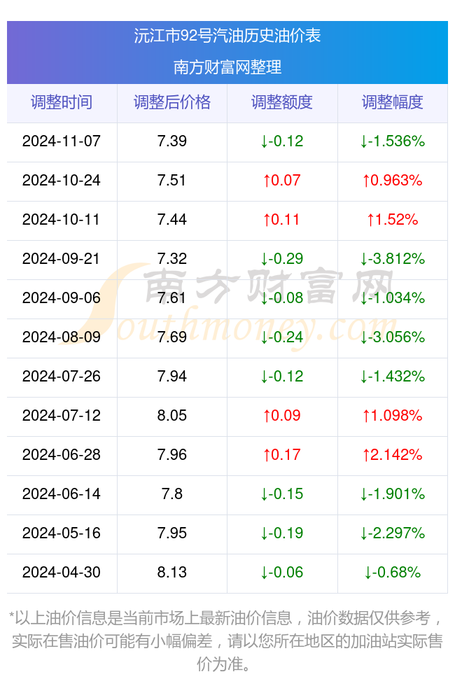 以上数据仅供参考,请以您所在地区的加油站实际售价为准。油价发布此信息的目的在于传播更多信息,对使用该油价信息所导致的结果概不承担责任。