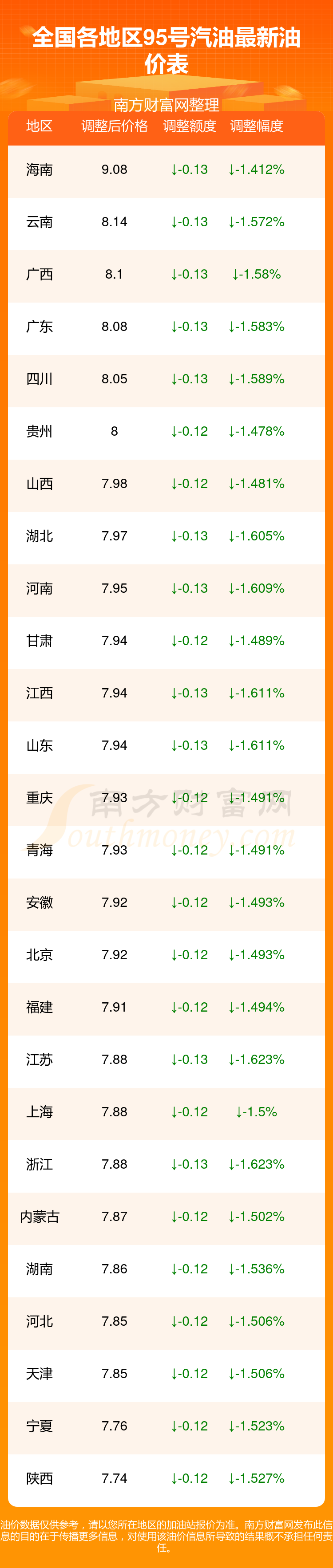 11月24日全国95号汽油价格具体为(调整时间为11月7日):平均价格8元/升,其中全国95号汽油最低为陕西,价格为7.74元/升,95号汽油最高为海南,价格为9.08元/升。