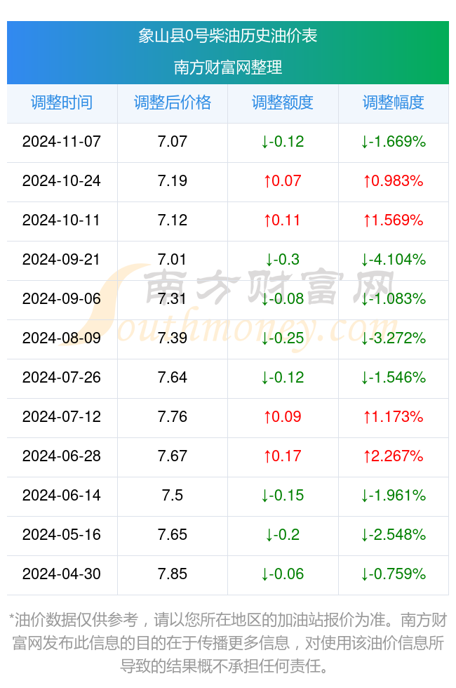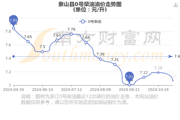 11月24日,象山县0号柴油价格为每升7.07元,这是11月7日油价调整后的价格,相对上次调整时间10月24日的油价7.19元每升,跌了0.12元,跌1.669%。
