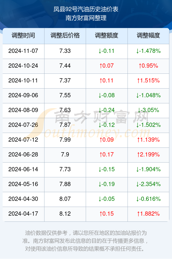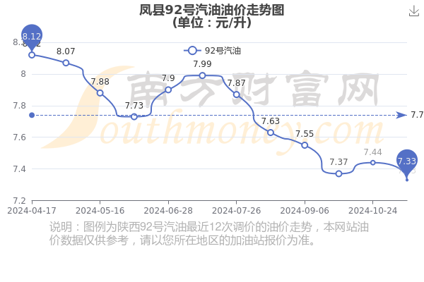 凤县92号汽油11月24日最新价格为11月7日油价调整后的价格,具体为7.33元/升,相对上次调整时间10月24日的油价7.44元每升,共降了0.11元,降1.478%。